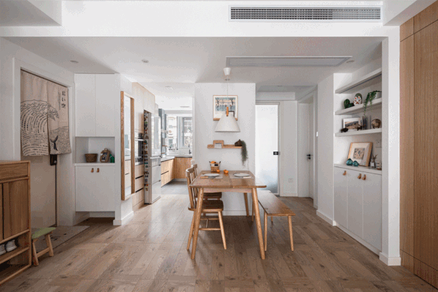 原木色餐椅、板凳、置物架,搭配白墙,整个空间都散发着一股清新淡雅的气质。
